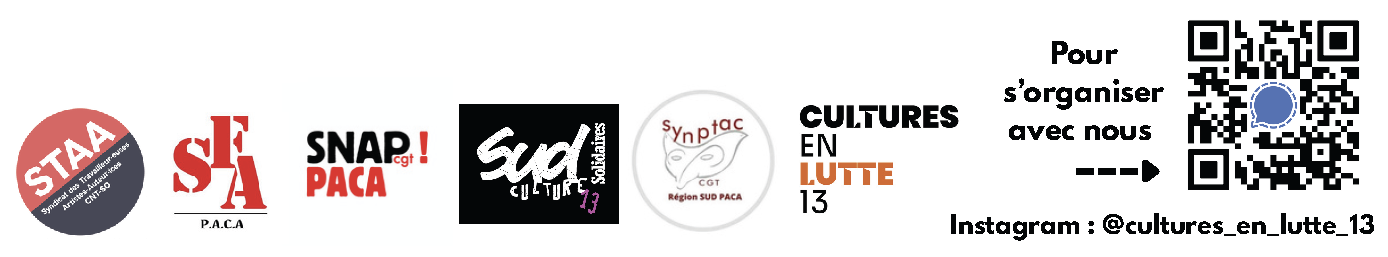 AG Cultures en lutte 13, SNAP CGT Paca, SFA CGT Paca, STAA 13 CNT-SO, SUD Culture 13, Synptac CGT – Paca