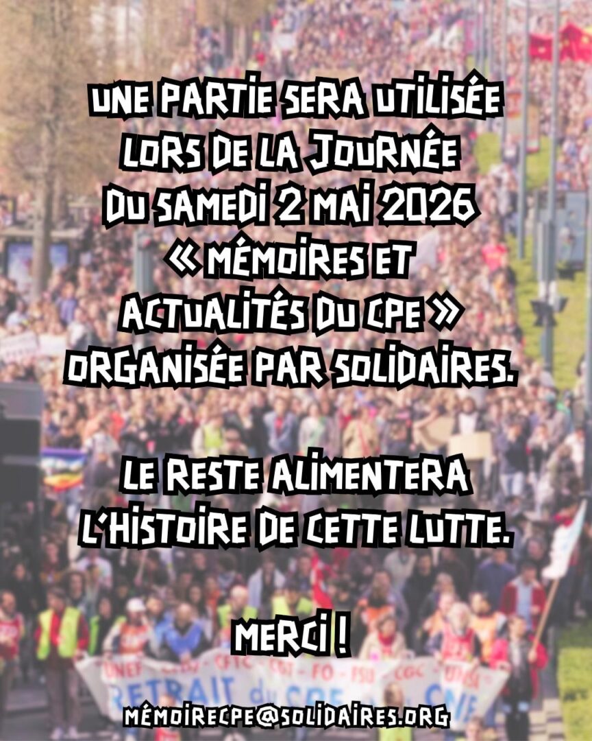 Si vous avez participé au CPE en tant que syndiqué·e, en tant qu’étudiant·e, lycéen·ne, chômeureuse, travailleureuse… Envoyez votre témoignage ! Toutes les formes sont les bienvenues : audio, écrit, dessiné ou contactez nous par mail pour que nous le recueillions à l’oral.
